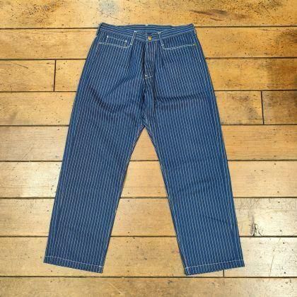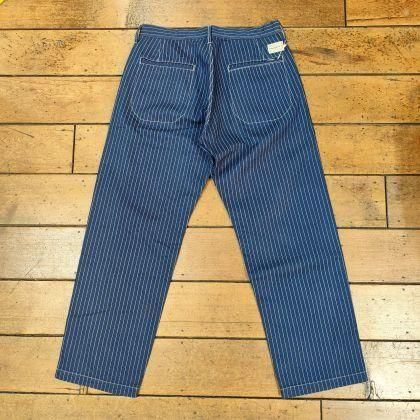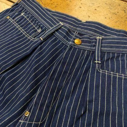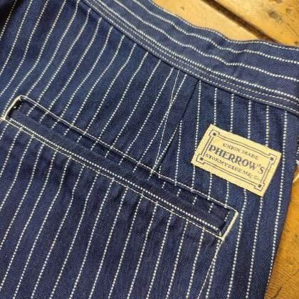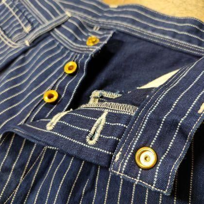 こちらはお馴染みのインディゴウォバッシュ。フェローズがオリジナルで製作している生地で、深いネイビーが魅力のインディゴ生地に、ドットでストライプ柄を抜染プリントしています。インディゴ部分は色落ちをしていき、経年変化をたっぷりと楽しめます。