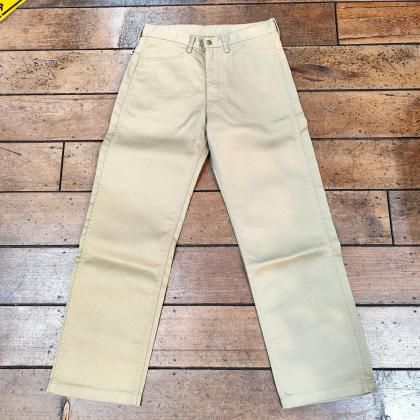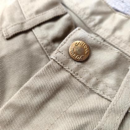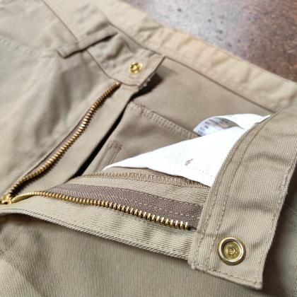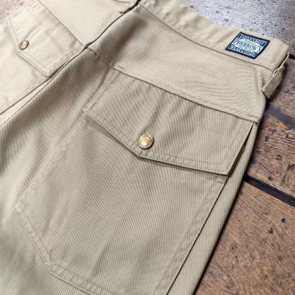 堅牢なハンティングトラウザーズの古着を参考に ランバージャック(木こり)用のワークパンツを想定して製作された一本です。 綾目の立った厚手のT/Cチノクロスを使用したことで、 カジュアル度を増しタウンユースのチノパンに。 古着同様に太めのシルエットにしたことで 現代のファッションにも馴染んでくれるスタイルに仕上がっています。