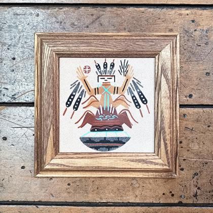 サンドペインティングは本来メディスンマンだけが描くことを許されたもので、そのモチーフから得るパワーで心や身体の病を治療する儀式の為に作られたものです。こちらは儀式に使われる絵とは若干異なるものを芸術品として制作したものです。