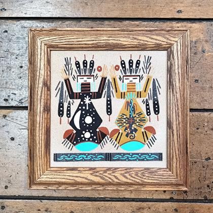 サンドペインティングは本来メディスンマンだけが描くことを許されたもので、そのモチーフから得るパワーで心や身体の病を治療する儀式の為に作られたものです。こちらは儀式に使われる絵とは若干異なるものを芸術品として制作したものです。